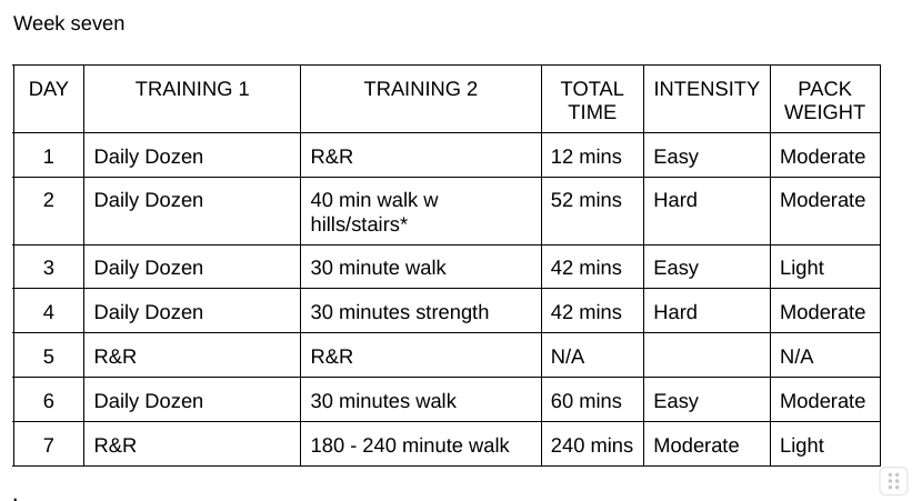We’ve added three new training actions in week seven. And this is on top of last week’s additions of Tempo and Interval Training. Thank you for following along. Everything added is intended to be purposeful and designed to create a well-rounded well-balanced level of fitness and readiness for the significant challenge which the Camino can offer.